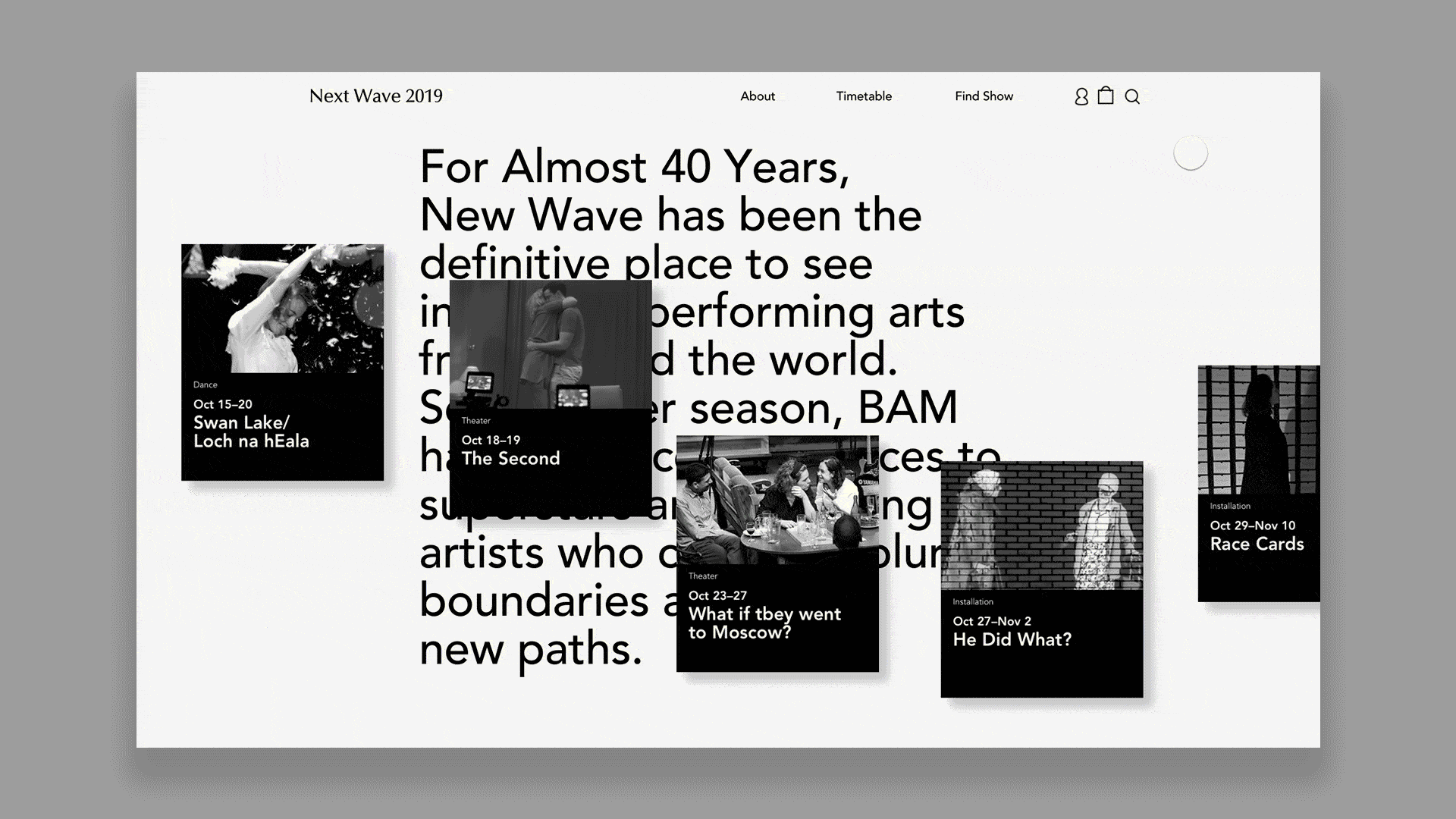 Next Wave festival is one of BAM's biggest events, lasting from November to January, with various events ranging from videos, performances, and artist talks. Nevertheless, Next Wave was represented by a single page on the official BAM website, and learning about it was inconvenient because the information was overlapping with other BAM programs. Given this point of view, I created a single, independent website allowing users to enjoy the festival efficiently.